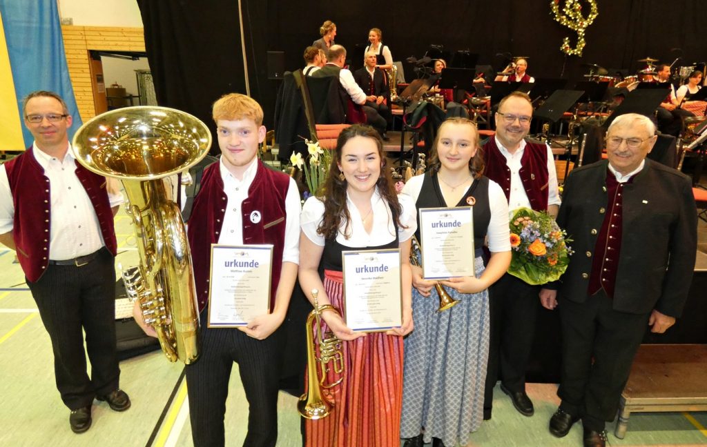 Foto (mmü): Beim Frühjahrskonzert der Musikkapelle Grabenstätt erhielten die Jungmusikanten (Ab Zweiter von links) Matthias Kumm (Tuba/Silber) Veronika Waldherr (Flügelhorn/Bronze) und Josephine Purzeller (Flügelhorn/Bronze) ihre Musikerleistungsabzeichen. Der 1. Vorsitzende des Musikvereins Grabenstätt Franz Klauser (links), der Dirigent der großen und kleinen Musikkapelle Grabenstätt Christian Bergmann (Zweiter von rechts) und der Ehrendirigent Sepp Hollerauer waren sichtlich stolz auf sie.