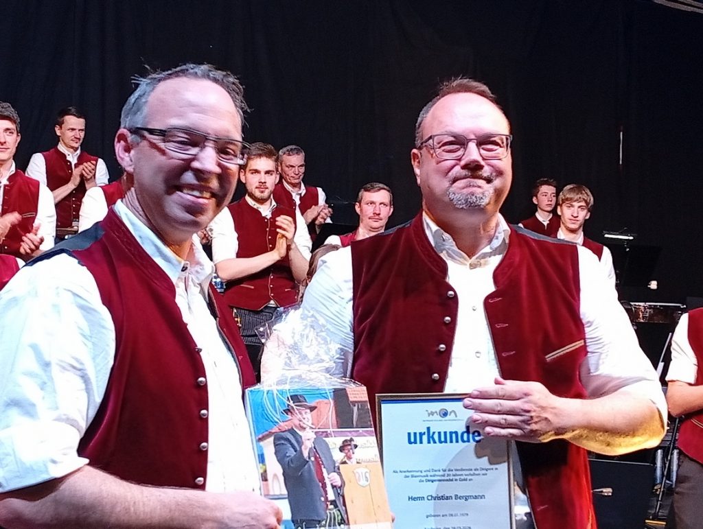 Foto (mmü): Seit 20 Jahren schwingt Christian Bergmann (rechts) in Grabenstätt den Dirigentenstab. Der 1. Vorsitzende des Musikvereins Franz Klauser dankte ihm beim Frühjahrskonzert der Musikkapelle und Jugendkapelle herzlich für sein großes Engagement.
